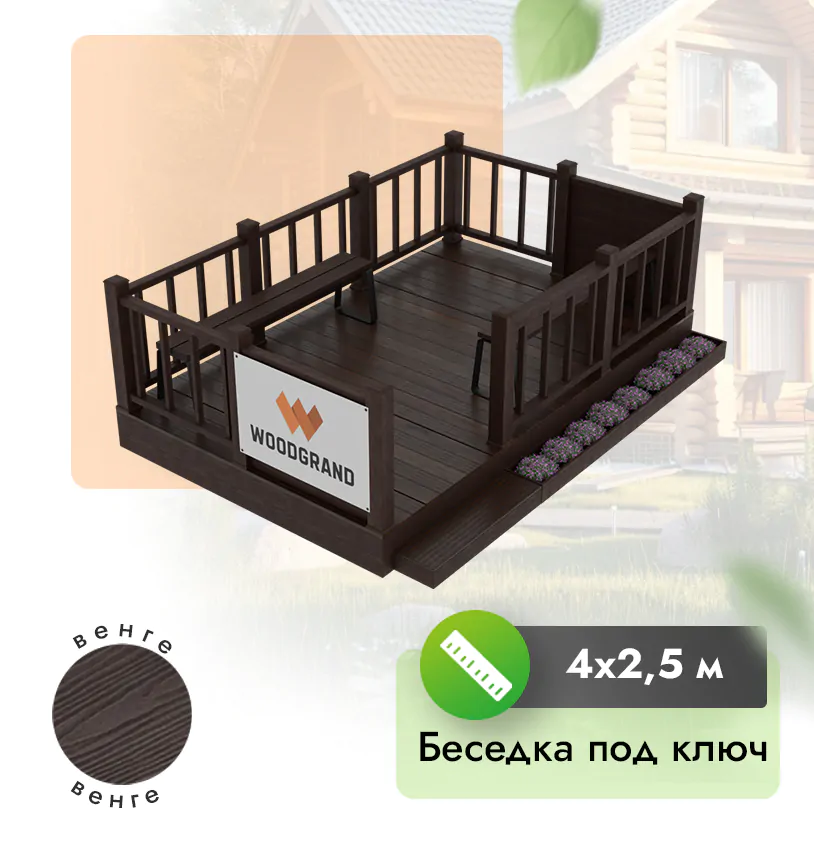 Наш декинг из ДПК выдерживает до 3318 кг/м2, влагостойкий, не требует ухода.